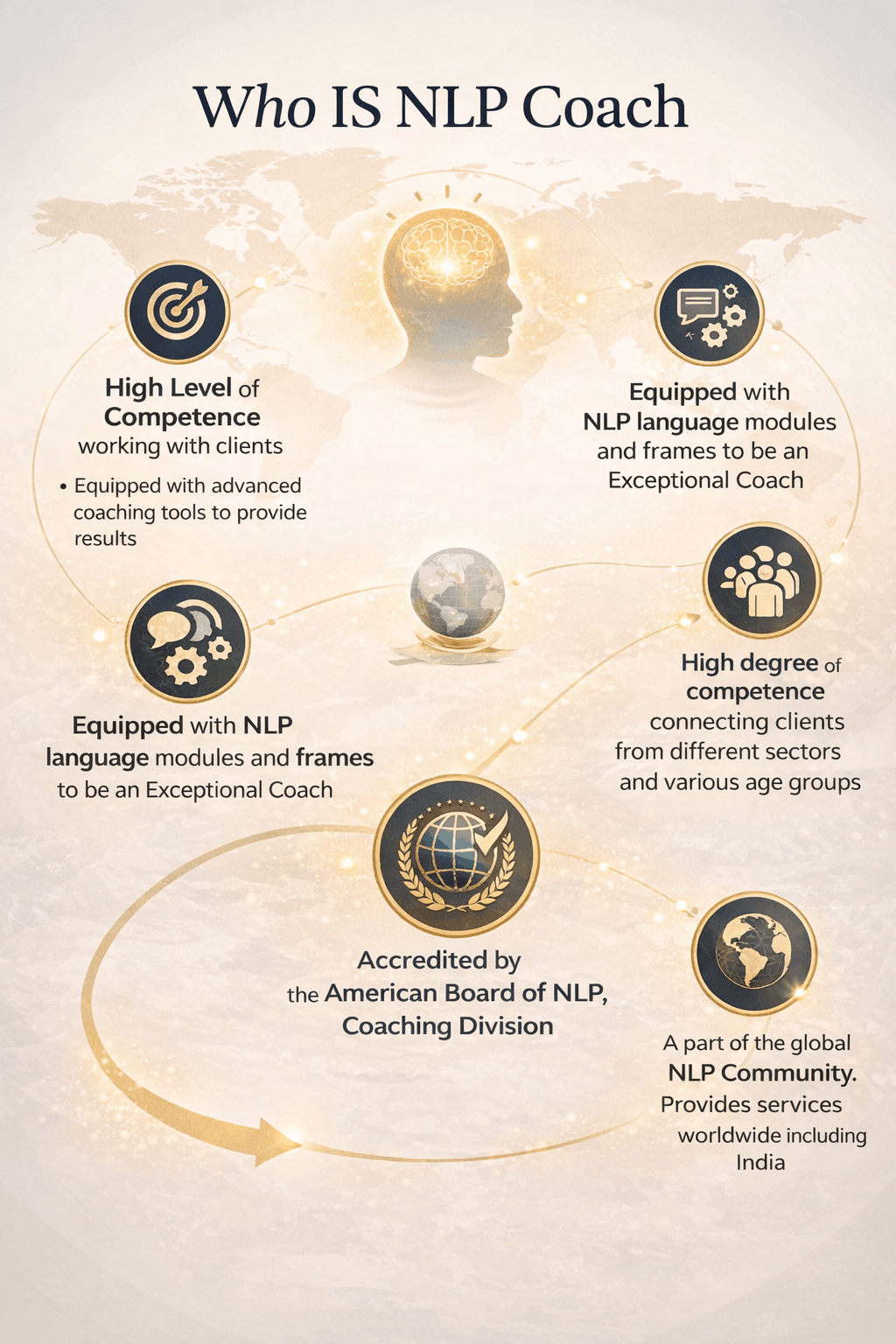 - An NLP Coach who has a high degree of competence to connect with clients from different sectors and various age groups