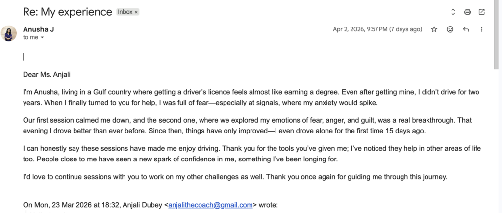 Anusha started personalised sessions In January 2026,  in just 3 to 4 sessions, she has progressed from driving alone to driving in heavy traffic, evenings and enjoying driving, NLP, Time Line Therapy (r) for faster results.  2